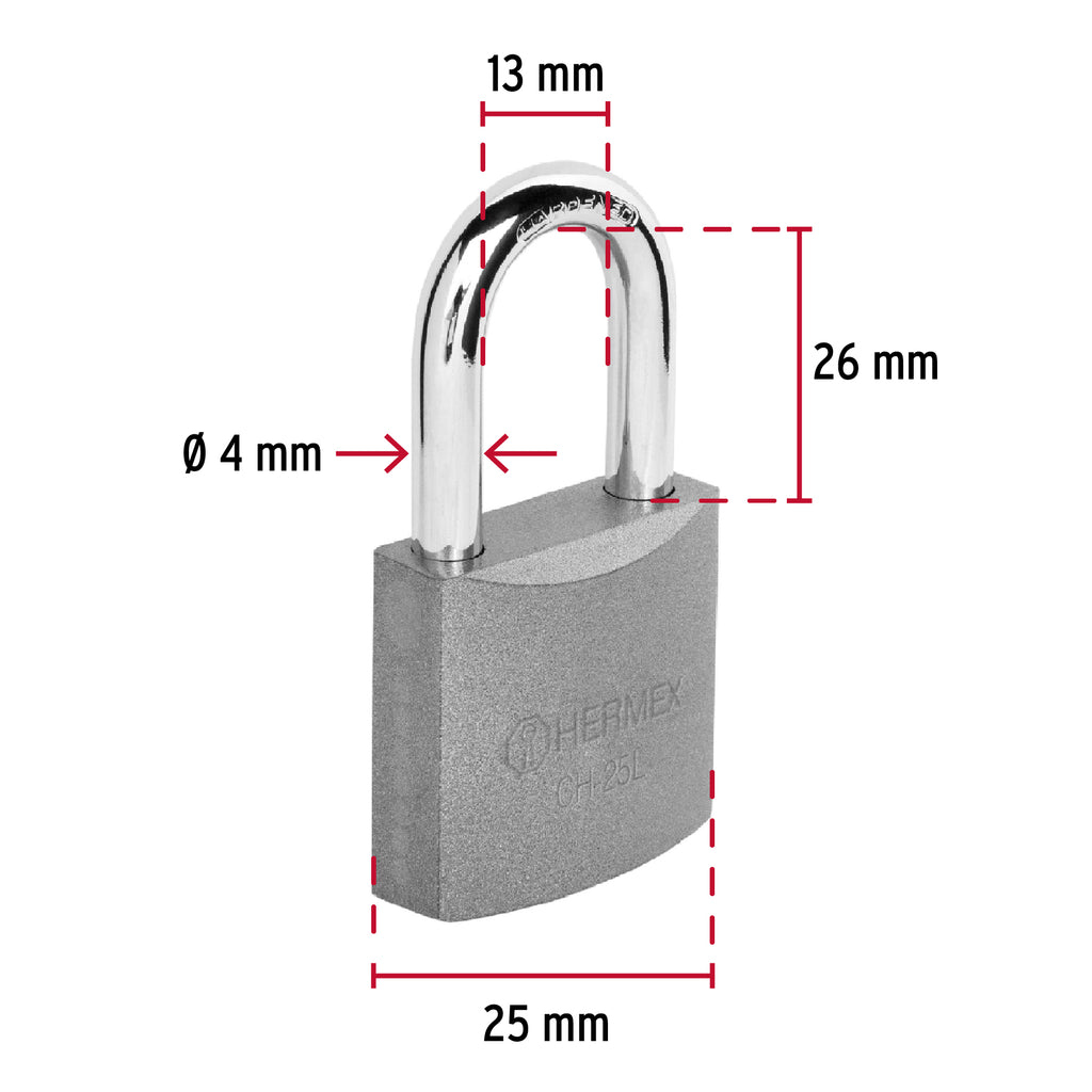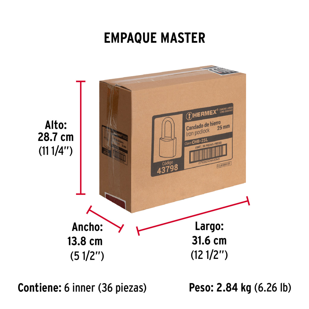 Candado de hierro 25 mm gancho largo en blíster, HERMEX
