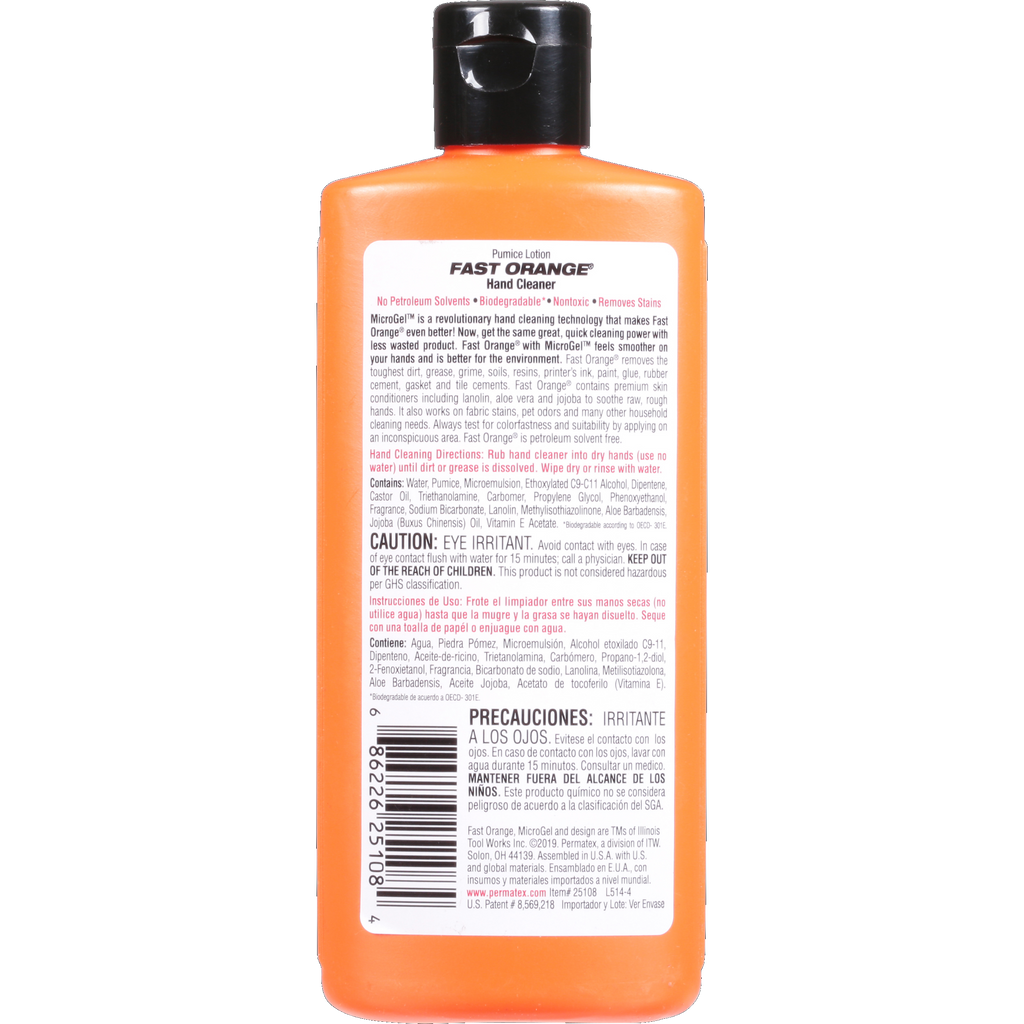 - Permatex Fast Orange® Hand Cleaner es un producto biodegradable limpiador de manos que no contiene solventes derivados del petróleo. Limpia manos con una nueva tecnología MicroGel™ exclusiva de Permatex. Este limpiador de manos tiene un aroma cítrico fresco y no contiene fragancias artificiales. Tanto la fórmula de la crema como la de la loción son disponible en liso o piedra pómez. Limpiadores de manos naranjas rápidos contienen aloevera, lanolina, propilenglicol, aceite de jojoba y vitamina E para el acondicionamiento de la piel.