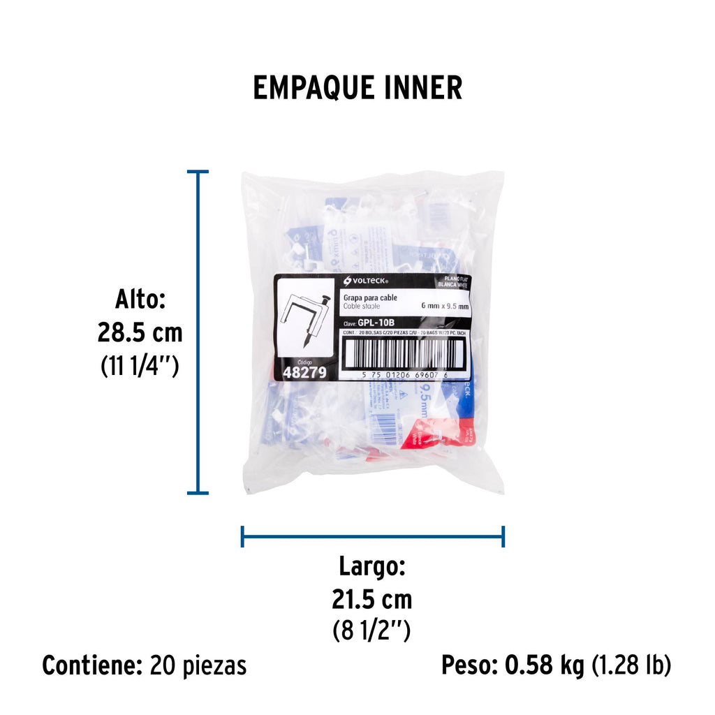 Bolsa con 20 grapas blancas de 6 x 9.5 mm para cable plano Volteck