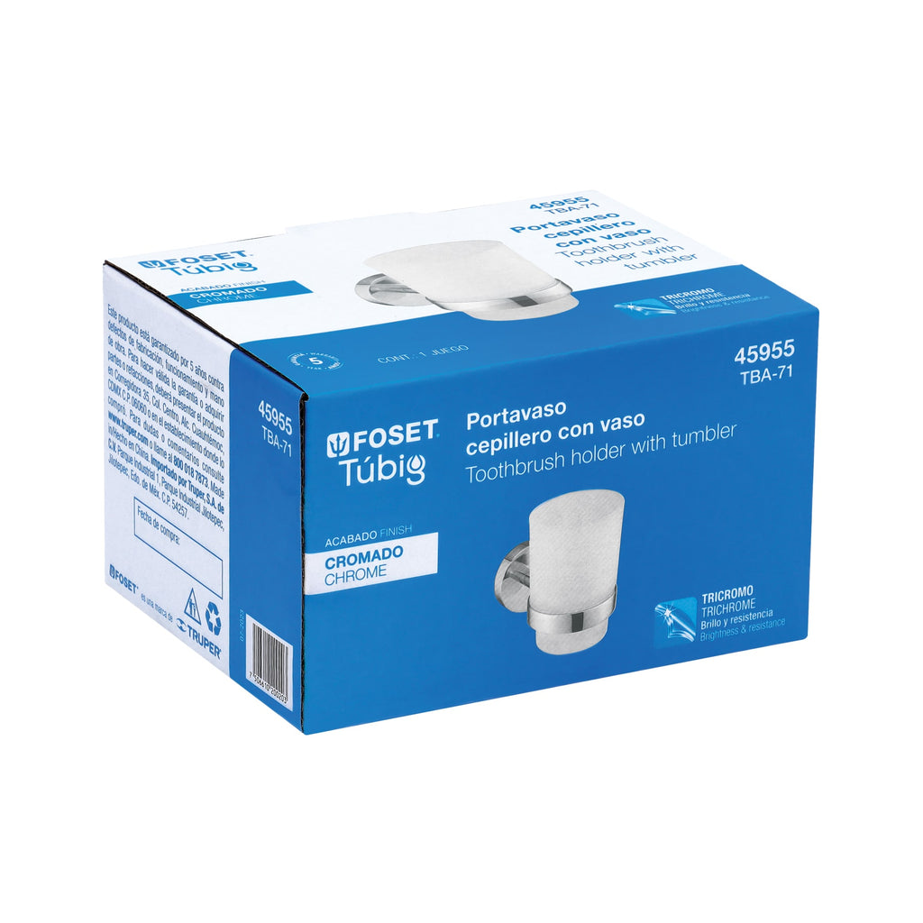 Portavaso cepillero cromo con vaso de vidrio, FOSET TÚBIG