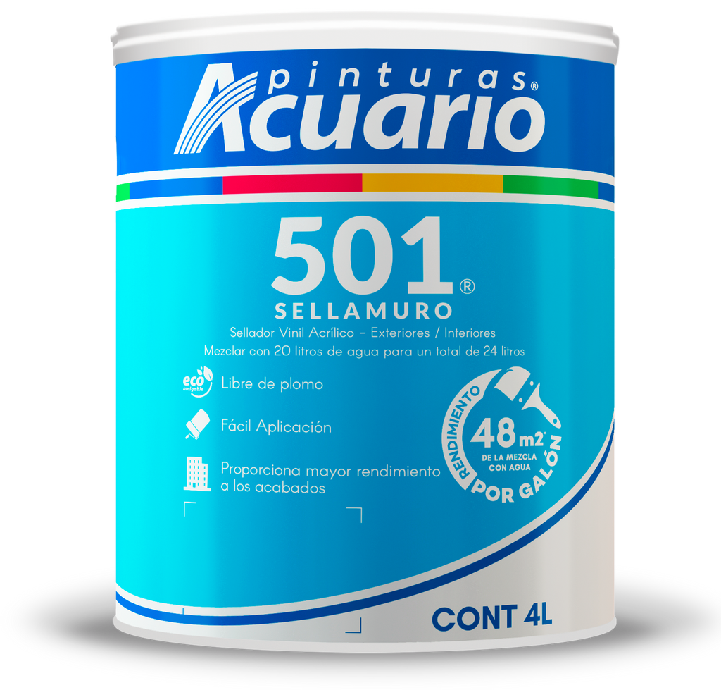 - EL sellamuro 501 es indispensable en el tratamiento de superficies de cemento, yeso, tablaroca, o cualquier tipo de aplanado previo a la aplicación del recubrimiento deseado. El uso del sellamuro 501 bloquea la porosidad del sustrato ayudando a obtener un mayor rendimiento del recubrimiento final, aumentando el tiempo de vida del acabado. Recomendado para superficies tratadas anteriormente que requieren de mantenimiento o repintado.